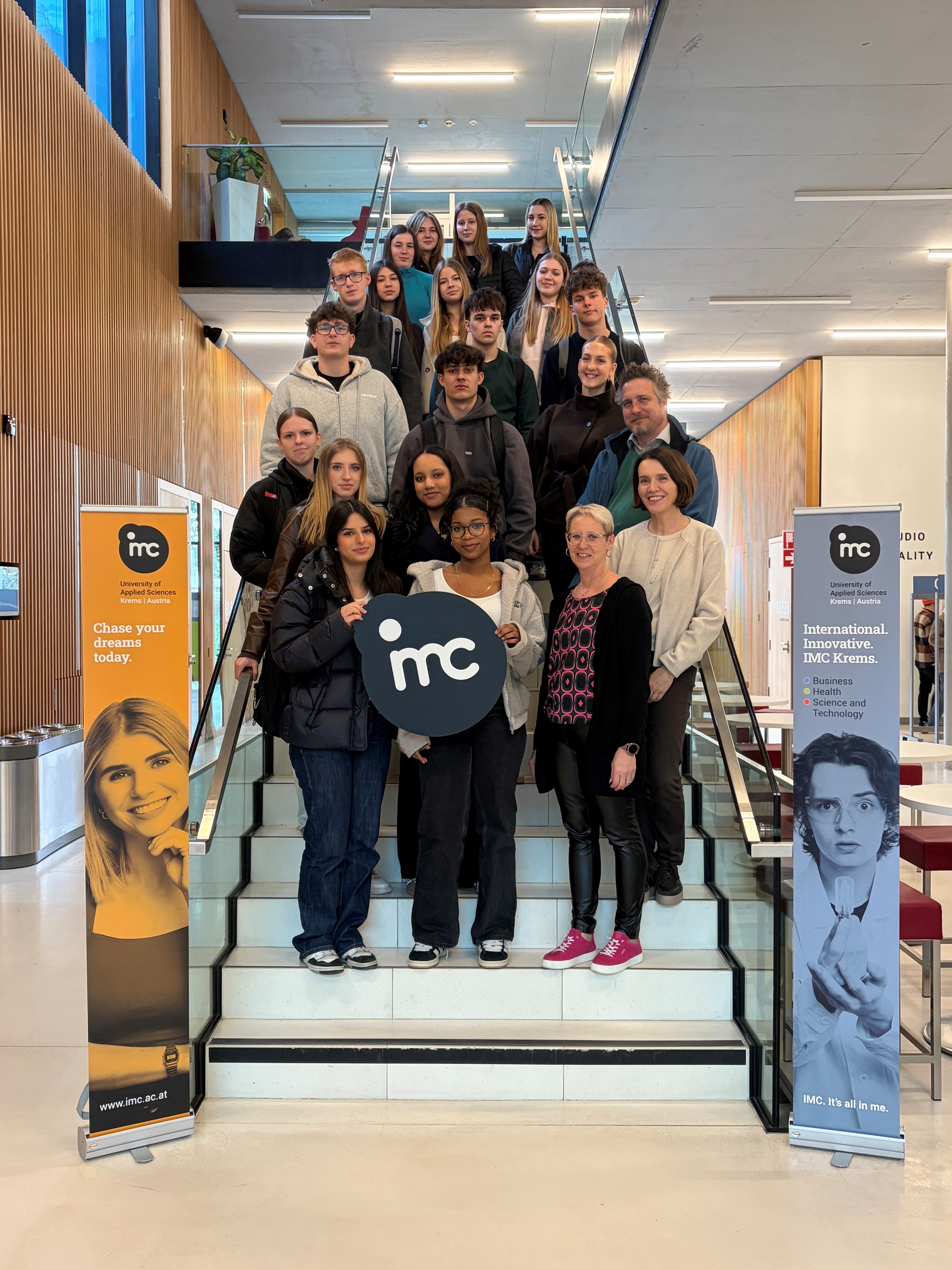 Im Rahmen des KFT-Unterrichts haben die 3. Jahrgänge einen Ausflug zur Hochschule für angewandte Wissenschaften IMC Krems unternommen. Gleich zu Beginn wurden wir sehr freundlich empfangen und mit einer kleinen Jause und Goodie-Bags begrüßt, was für eine angenehme Stimmung gesorgt hat.